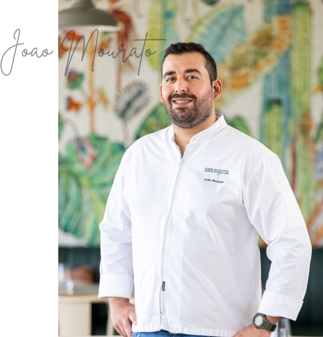 O Chef João Mourato reinventa os pratos tradicionais da região com um toque de modernidade, utilizando ingredientes frescos e locais para criar refeições tão autênticas quanto deliciosas. Cada prato é cuidadosamente harmonizado com os nossos vinhos Quinta do Quetzal, elevando cada mordida a uma jornada de sabor e descoberta.